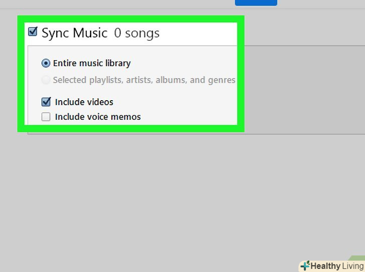 Задайте параметри синхронізації категорії. параметри залежать від категорії, але в будь-якому випадку встановіть прапорець біля «Синхронізація» у верхній частині головної панелі.- Можна вибрати певні типи даних для синхронізації. Наприклад, у категорії «Музика» виберіть синхронізацію всієї медіатеки або певних списків відтворення.