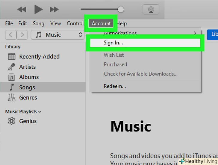 Увійдіть в iTunes за допомогою свого Apple ID.якщо ви що-небудь купували в магазині iTunes (додатки, книги, фільми тощо), авторизація відкриє вам доступ до ваших покупок. Щоб увійти в систему, виконайте наступні дії.[3]- Відкрийте меню "Аккаунт" вгорі вікна.