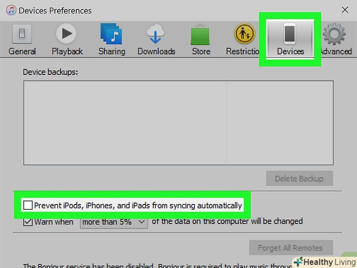 - Якщо ви не хочете, щоб пристрій синхронізувався автоматично, встановіть прапорець біля «заборонити автоматичну синхронізацію пристроїв iPod, iPhone і iPad», а потім натисніть «ОК». Зробіть так, якщо ви підключаєтеся до iTunes на чужому комп'ютері (або комп'ютері, який не є вашим основним комп'ютером).
