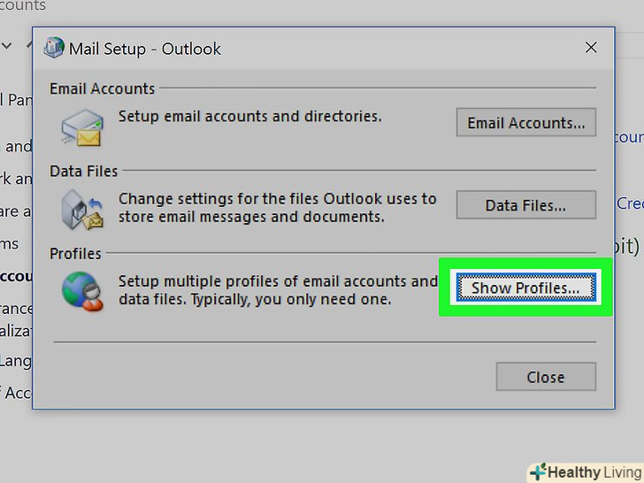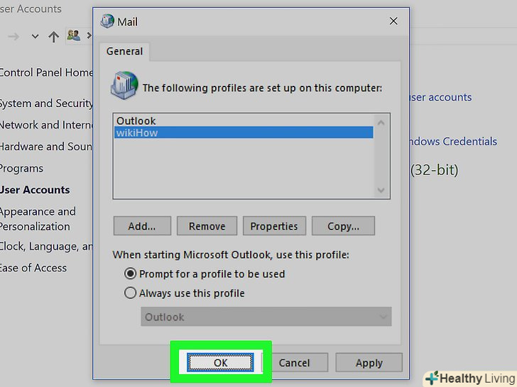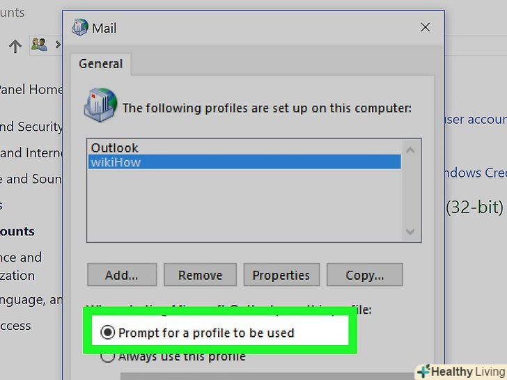 Додайте новий профіль до Outlook.у діалоговому вікні Налаштування пошти натисніть кнопку "Показати«, а потім натисніть кнопку»Додати". Введіть ім'я для профілю. Натисніть OK.[2]