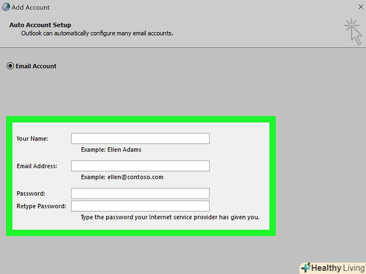 Налаштуйте обліковий запис електронної пошти.заповніть інформацію для нового облікового запису електронної пошти. Якщо вам потрібна допомога, зв'яжіться зі своїм провайдером або Адміністратором Outlook.