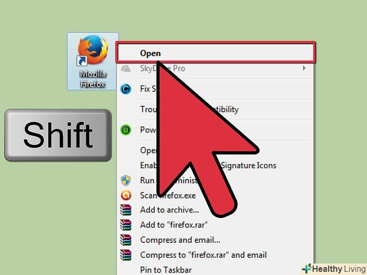 Запустіть Firefox в безпечному режимі.у цьому випадку ви зможете скинути Firefox, навіть якщо він не відкривається.[3]- У Windows затисніть⇧ Shift, а потім клацніть по значку Firefox. Якщо це не спрацювало, на вашому комп'ютері знайдіть ярлик під назвою «Mozilla Firefox (Safe Mode)».
