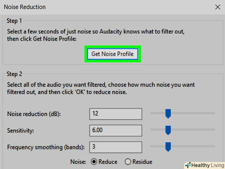 КлацнітьОтримати профіль шуму.ця кнопка знаходиться у верхній частині вікна. Вона допоможе Audacity визначити, що є або не є фоновим шумом.