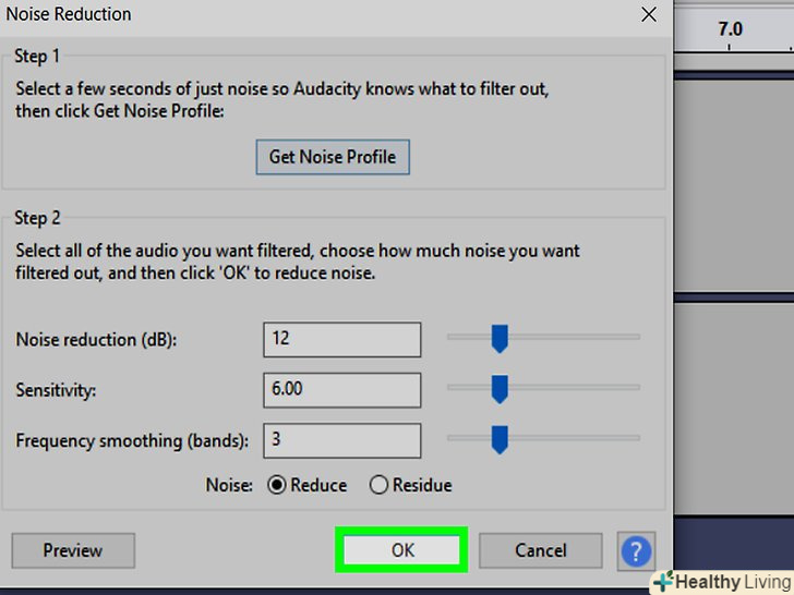 КлацнітьOK. Кнопка знаходиться в нижній частині вікна. Програма видалить фоновий шум на обраній ділянці треку.