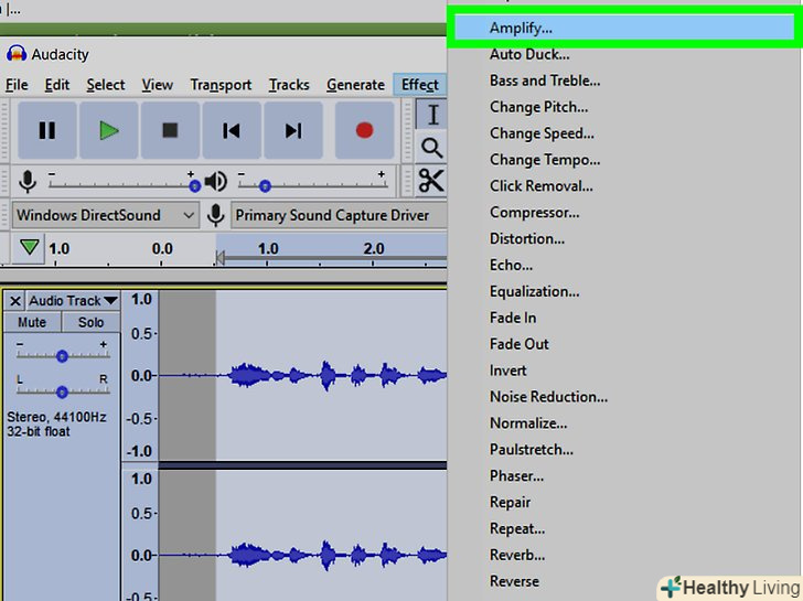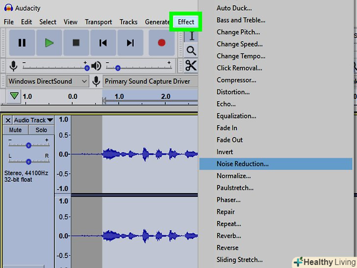 КлацнітьЕфекти. Вкладка знаходиться у верхній частині вікна Audacity (Windows) або у верхній частині екрана (Mac). Відкриється випадаюче меню.