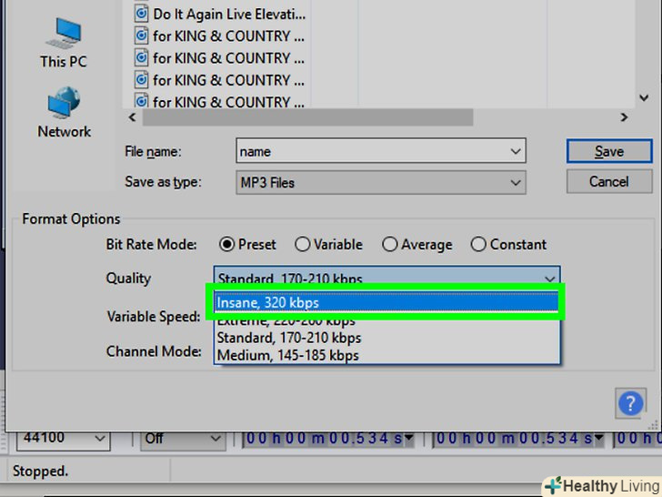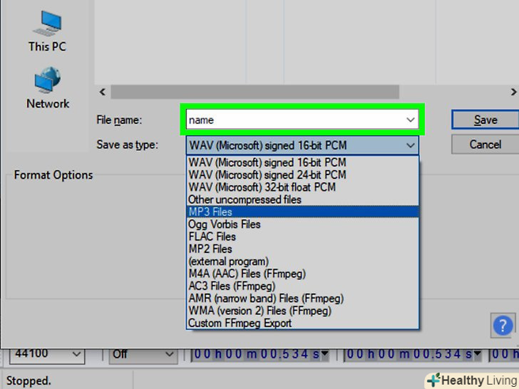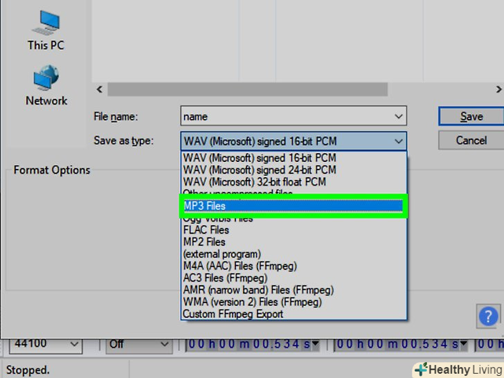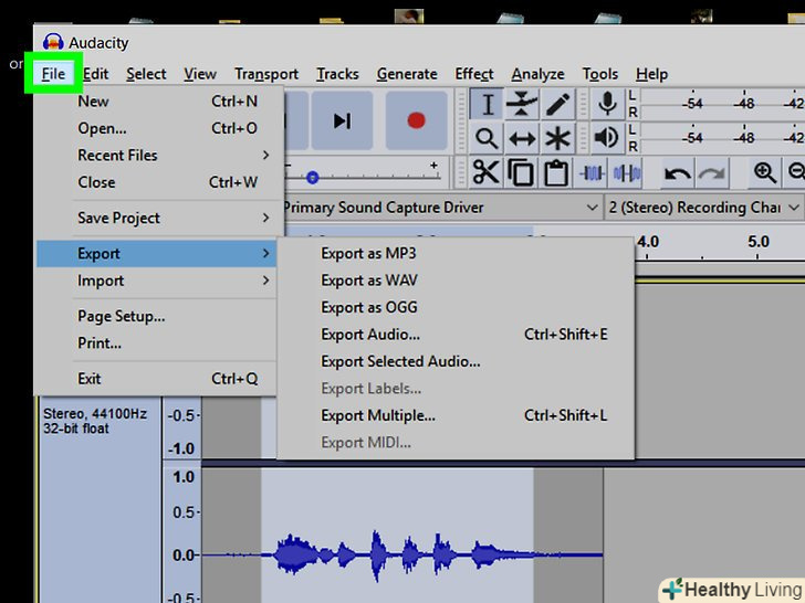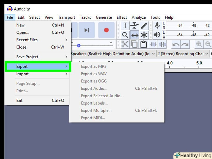 КлацнітьЕкспорт аудіоданих.... Пункт знаходиться в середній частині меню, що випадає. Відкриється нове вікно. У разі повідомлення про помилку «кодека LAME» спочатку потрібно зробити наступне:- Windows – відкрийте посилання і клацніть Lame v3.99. 3 for Windows.exe. Двічі клацніть по інсталяційному файлу, клацніть Так при запиті і дотримуйтесь вказівок на екрані.