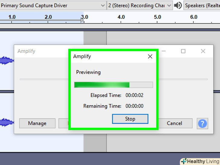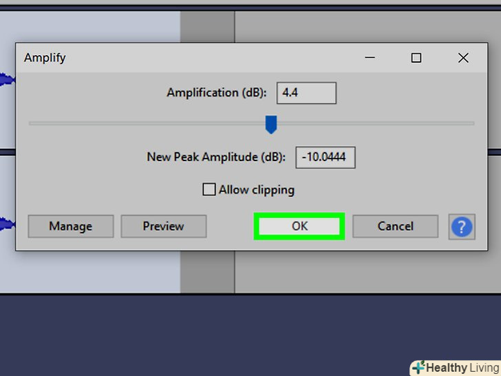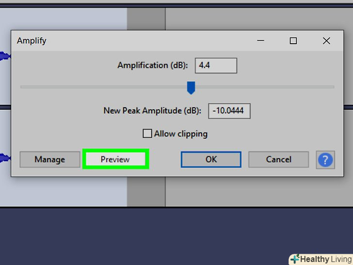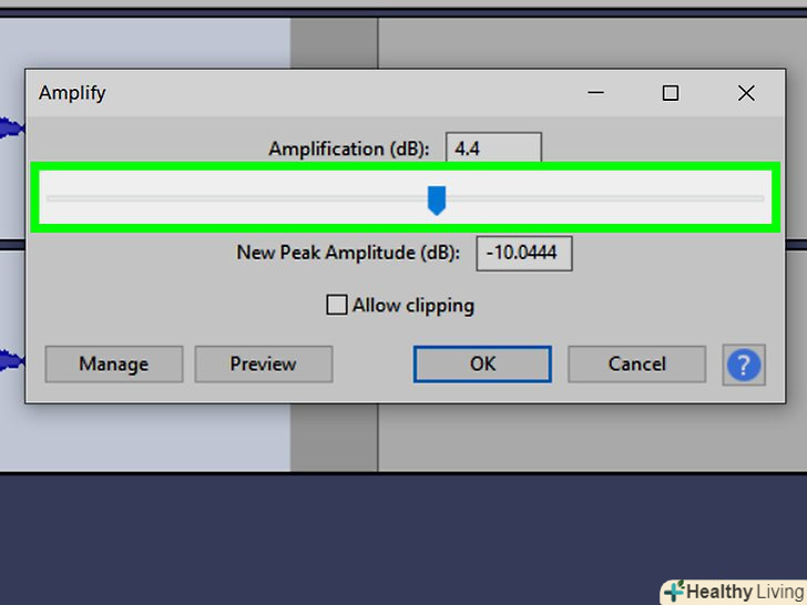 Клацніть і перетягуйте повзунок вліво. повзунок "посилення" знаходиться по центру вікна. Його потрібно перетягнути вліво, щоб знизити гучність вибраної ділянки і знизити клацання.- Важливо не перестаратися. Досить перетягнути повзунок на один-два децибела вліво.