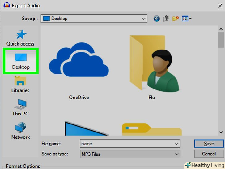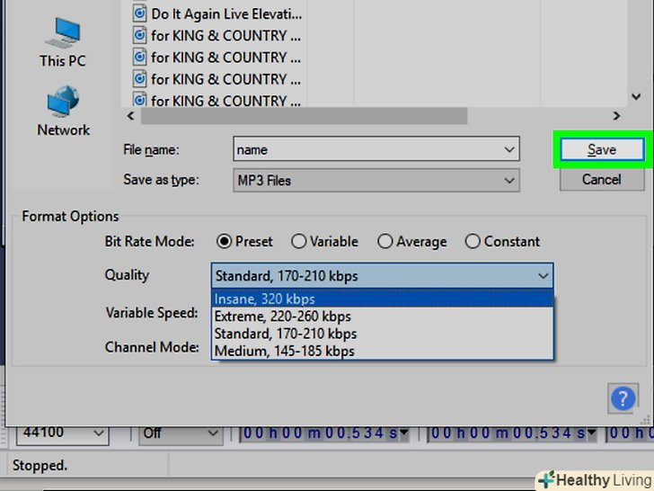 Виберіть місце збереження. клацніть по одній з папок в лівій частині вікна. На комп'ютерах Mac іноді спочатку потрібно клацнути спадний список "Перегляд", щоб вибрати папку.- КлацнітьЗберегти. Кнопка знаходиться в правій нижній частині вікна. Ваш проект буде збережений як файл формату MP3 і експортований в найвищій якості.