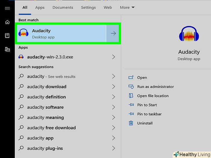 Відкрийте Audacity.Іконка програми виглядає як помаранчева звукова хвиля між синіми навушниками.