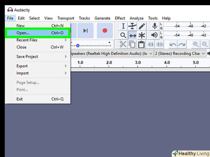 КлацнітьФайл. Вкладка знаходиться в лівому верхньому кутку вікна Audacity (Windows) або в лівій верхній частині екрана (Mac). З'явиться меню, що випадає.