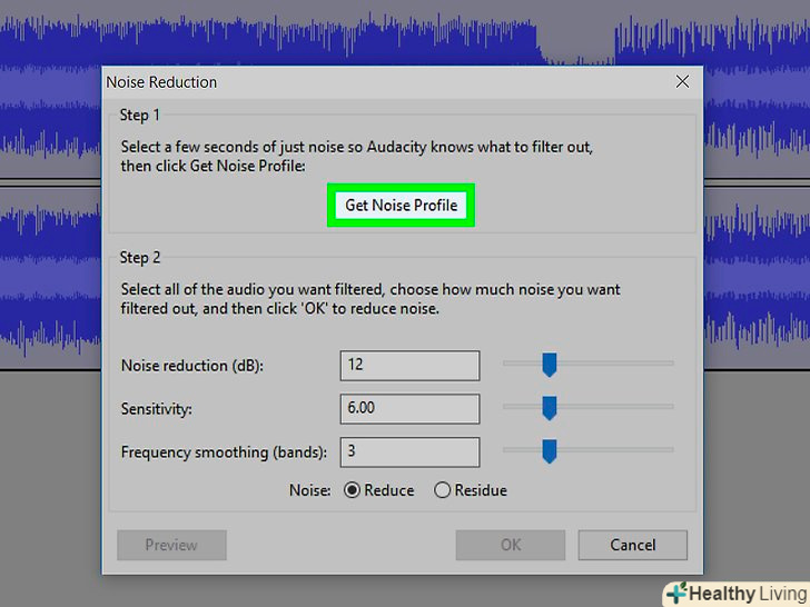 Натисніть < span class="nowrap" title="This is not a clickable button; it illustrates the button one should find." style="font-family: Segoe UI, Frutiger, Frutiger Linotype, Dejavu Sans, Helvetica Neue, Arial, sans-serif;letter-spacing:0px;padding:0em .6em; border:1px solid; border-color:#AAA #555 #555 #AAA; -moz-border-radius: 0px; -webkit-border-radius: 0px; border-radius: 0px; background-color: #F2F2F2; background-image: -moz-linear-gradient(top, #FCFCFC, #E0E0E0); background-image: -o-linear-gradient(top, #FCFCFC, #E0E0E0); background-image: - webkit-linear-gradient(top, # FCFCFC, #E0E0E0); background-image: linear-gradient(top, #FCFCFC, #E0E0E0);">створити модель шуму. цей пункт знаходиться у верхній частині нового вікна. Він дозволяє розпізнати шум та іншу звукову інформацію, щоб відфільтрувати фоновий шум і зберегти цілісність аудіозапису.- Для ефективності цієї функції довжина звукового уривка повинна бути більше трьох секунд.