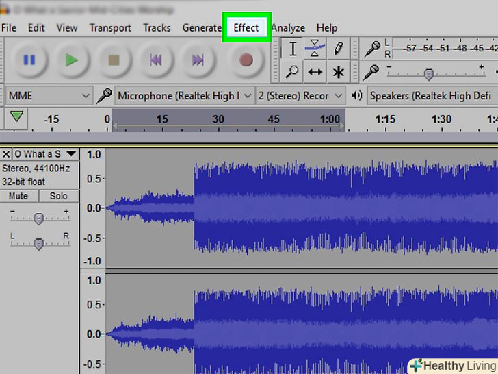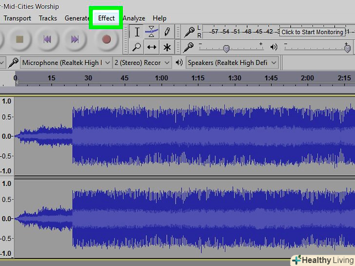 Натисніть вкладку < span class="nowrap" title="This is not a clickable button; it illustrates the button one should find." style="font-family: Segoe UI, Frutiger, Frutiger Linotype, Dejavu Sans, Helvetica Neue, Arial, sans-serif;letter-spacing:0px;padding:0em .6em; border:1px solid; border-color:#AAA #555 #555 #AAA; -moz-border-radius: 0px; -webkit-border-radius: 0px; border-radius: 0px; background-color: #F2F2F2; background-image: -moz-linear-gradient(top, #FCFCFC, #E0E0E0); background-image: -o-linear-gradient(top, #FCFCFC, #E0E0E0); background-image: - webkit-linear-gradient(top, # FCFCFC, #E0E0E0); background-image: linear-gradient(top, #FCFCFC, #E0E0E0);">ефекти. вона знаходиться на панелі інструментів у верхній частині екрана (Mac) або вікна Audacity (Windows).