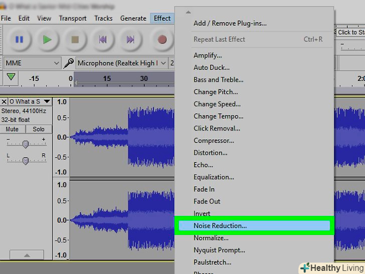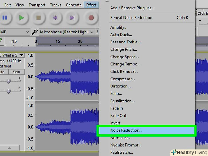 Натисніть < span class="nowrap" title="This is not a clickable button; it illustrates the button one should find." style="font-family: Segoe UI, Frutiger, Frutiger Linotype, Dejavu Sans, Helvetica Neue, Arial, sans-serif;letter-spacing:0px;padding:0em .6em; border:1px solid; border-color:#AAA #555 #555 #AAA; -moz-border-radius: 0px; -webkit-border-radius: 0px; border-radius: 0px; background-color: #F2F2F2; background-image: -moz-linear-gradient(top, #FCFCFC, #E0E0E0); background-image: -o-linear-gradient(top, #FCFCFC, #E0E0E0); background-image: - webkit-linear-gradient(top, # FCFCFC, #E0E0E0); background-image: linear-gradient(top, #FCFCFC, #E0E0E0);">придушення шуму.цей пункт знаходиться трохи нижче середини випадаючого меню Ефекти.
