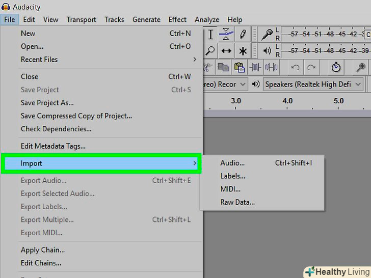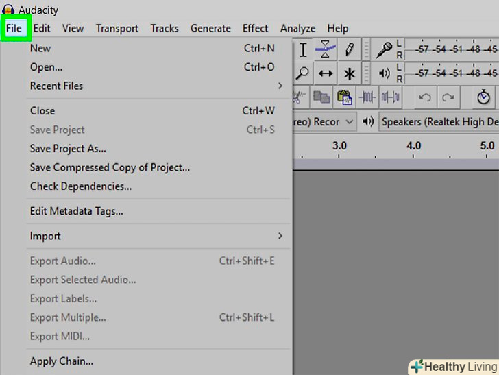 Натисніть < span class="nowrap" title="This is not a clickable button; it illustrates the button one should find." style="font-family: Segoe UI, Frutiger, Frutiger Linotype, Dejavu Sans, Helvetica Neue, Arial, sans-serif;letter-spacing:0px;padding:0em .6em; border:1px solid; border-color:#AAA #555 #555 #AAA; -moz-border-radius: 0px; -webkit-border-radius: 0px; border-radius: 0px; background-color: #F2F2F2; background-image: -moz-linear-gradient(top, #FCFCFC, #E0E0E0); background-image: -o-linear-gradient(top, #FCFCFC, #E0E0E0); background-image: - webkit-linear-gradient(top, # FCFCFC, #E0E0E0); background-image: linear-gradient(top, #FCFCFC, #E0E0E0);">Файл. Вкладка знаходиться в лівому верхньому кутку екрану (Mac) або в лівому верхньому кутку вікна програми Audacity (Windows).