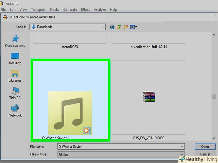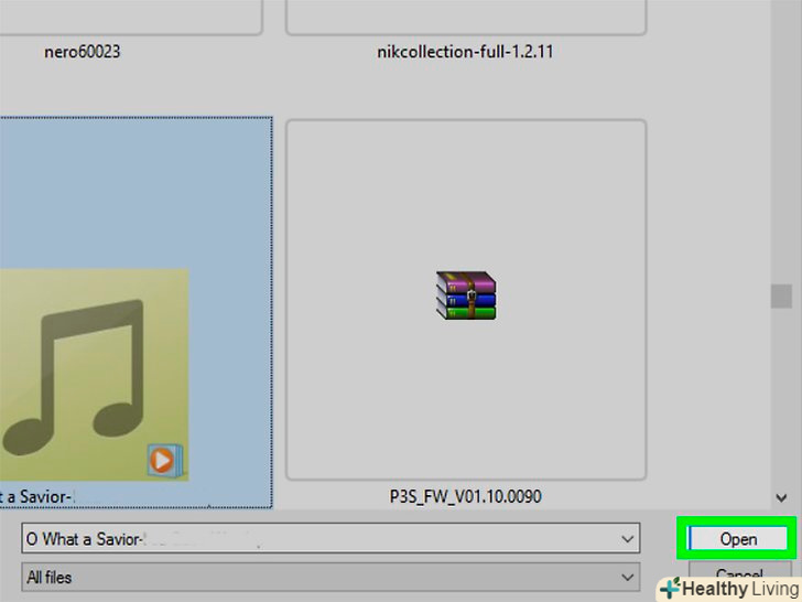 Виберіть аудіофайл.якщо ви не знаєте, де знаходиться потрібний файл, то пошукайте його в папках, які знаходяться в лівій частині вікна. Знайдіть необхідний файл і клацніть по ньому, щоб вибрати.