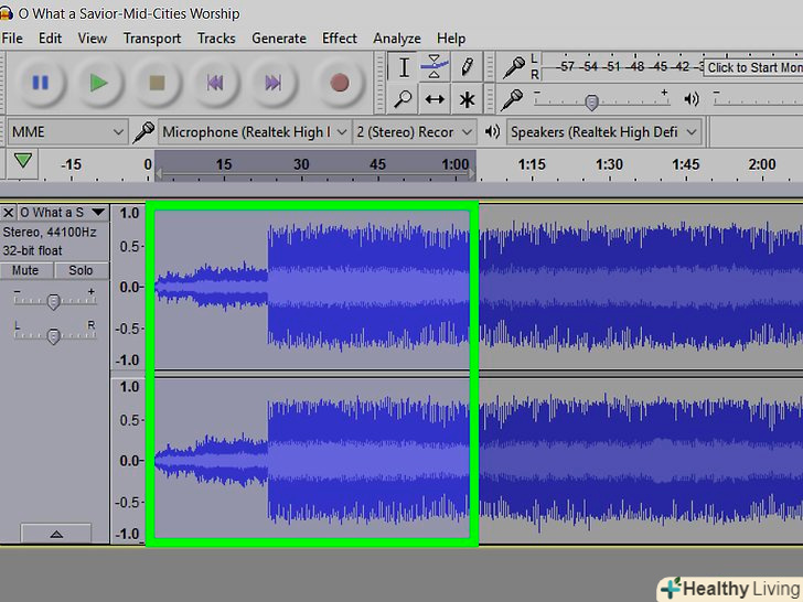 Виділіть частину файлу, яку необхідно редагувати.для цього затисніть курсор миші і перетягніть його до потрібної точки, після чого опустіть кнопку. Необхідна частина буде виділена сірої заливкою, яка підтверджує ваш вибір.- Щоб виділити всю доріжку, натисніть кнопку⌘ Command (Mac) або Ctrl (Windows) і кнопку A.