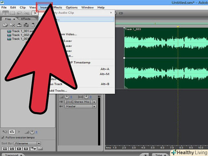 Вставка елементів. ви можете створити у вашому кліпі прогалини або додати в нього інші звуки і файли. Перенесіть курсор на потрібне місце, зайдіть в розділ " Вставка "і виберіть" аудіо " щоб вставити інший аудіофайл в даний відрізок. Правильніше буде обробити вставляється файл до вставки. Але і після вставки доведеться обробити стики і гучність, щоб файл звучав більш природно.
