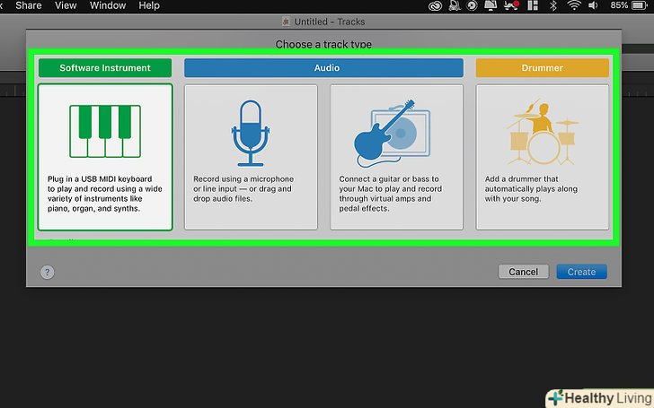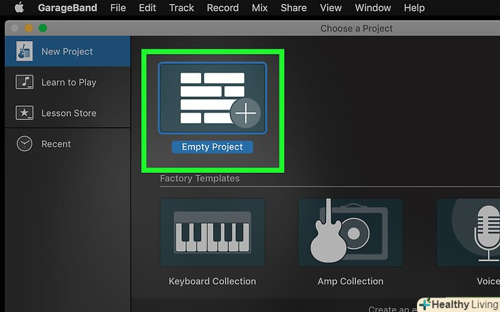 Відкрийте GarageBand і ви побачите вікно з різними видами проектів.виберіть проект "створення пісні" під вкладкою "новий проект".