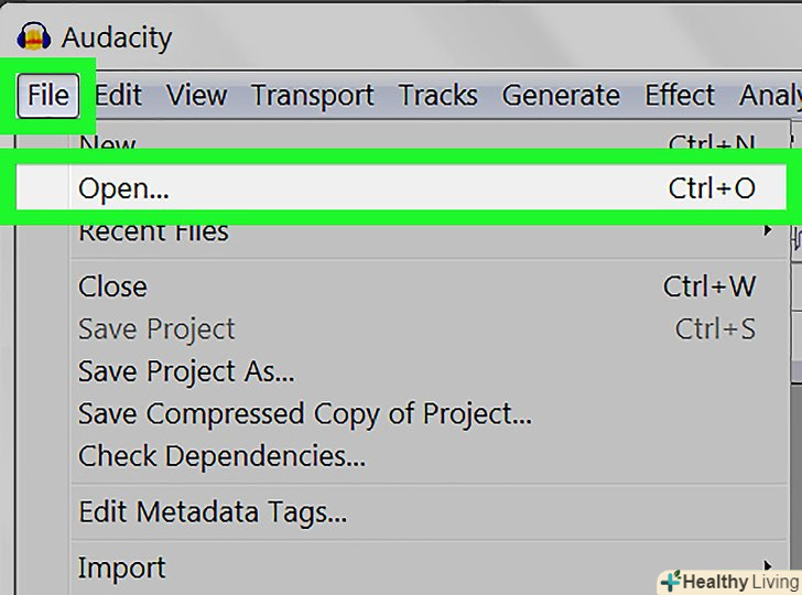 Відкрийте аудіофайл.Audacity підтримує більшість аудіоформатів, включаючи mp3, wav, aiff, flac, ogg і ffmpeg. Щоб відкрити аудіофайл:- ВиберітьФайл.