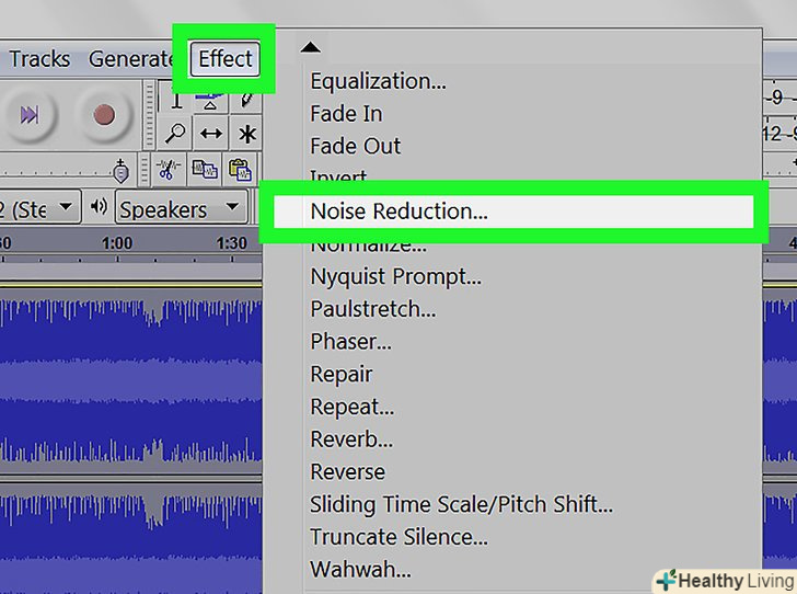 Застосуйте ефект придушення шуму. Щоб застосувати цей ефект, виділіть звукову доріжку, натиснувши Ctrl+A в Windows або ⌘ Command+A macOS. Потім натисніть на вкладку "ефекти «в рядку меню вгорі і виберіть»придушення шуму". Пересуньте повзунок " придушення шуму (дБ)» вправо, щоб зменшити відлуння і фоновий шум. Натисніть "прослухати" в лівому нижньому кутку. Якщо відлуння видалено, натисніть "OK", щоб застосувати ефект.- Цей ефект дозволить зменшити гучність і змінити висоту аудіо.