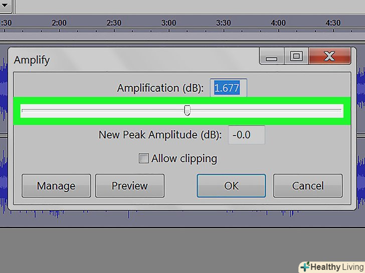 Застосуйте ефект посилення сигналу. Цей ефект дозволяє збільшити гучність аудіо. На вкладці "ефекти «знайдіть і виберіть»посилення сигналу". Пересуньте повзунок вправо, щоб збільшити гучність. Чи не збільшуйте гучність занадто сильно, інакше звук буде спотвореним. Натисніть "Прослухати". Якщо вас влаштовує рівень гучності, натисніть «OK», щоб застосувати ефект. В процесі редагування доріжок користуйтеся цим ефектом в міру необхідності.