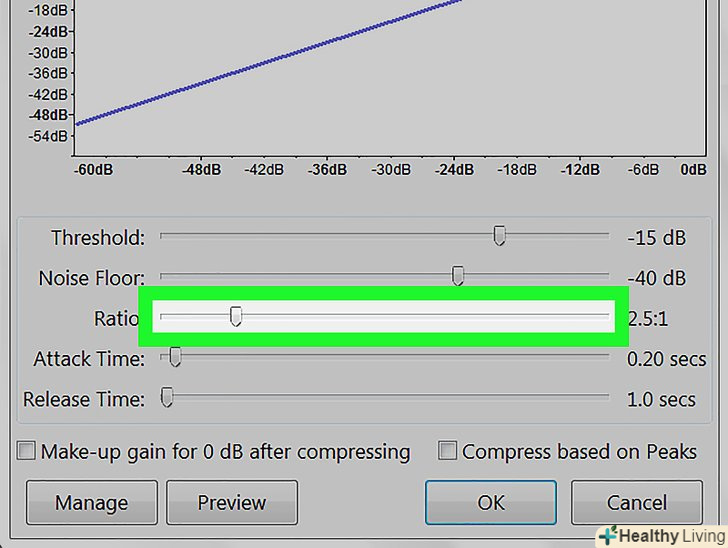 Застосуйте компресор.компресор дозволяє скоротити відстань між нижніми і верхніми піками звукової хвилі. Щоб застосувати компресор, клацніть по вкладці "ефекти«, а потім виберіть»компресор динамічного діапазону". Пересуньте повзунок в рядку» співвідношення " так, щоб лінія на графіку опустилася трохи нижче вихідної позиції. Також можна зменшити такі параметри, як» нижній поріг шумів «і»поріг". Клацніть "Прослухати". Якщо вас влаштовує результат, натисніть «OK», щоб застосувати ефект. Це зменшить гучність аудіо. У процесі редагування використовуйте цей ефект у міру необхідності.