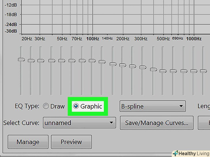 Застосуйте графічний еквалайзер.для цього виберіть "еквалайзер" у вкладці " ефекти». Зліва під графіком виберіть "Графічний «біля напису»Тип EQ". Пересувайте повзунки під еквалайзером для налаштування еквалайзера. Стовпчики зліва відповідають за нижні частоти, стовпчики праворуч — за верхні, а ті, що посередині — за середні. Натисніть "прослухати«, а потім» OK", щоб застосувати ефект.