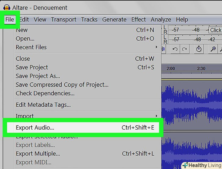Експортуйте аудіофайл.якщо вас влаштовує звучання аудіозапису, експортуйте її, щоб потім прослуховувати в медіаплеєрі. Щоб експортувати аудіофайл:- ВиберітьФайл У рядку меню вгорі.