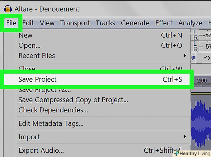 Збережіть проект.якщо ви плануєте редагувати Ваш аудіофайл в майбутньому, необхідно зберегти проект. Щоб зберегти проект:- ВиберітьФайл У рядку меню вгорі.