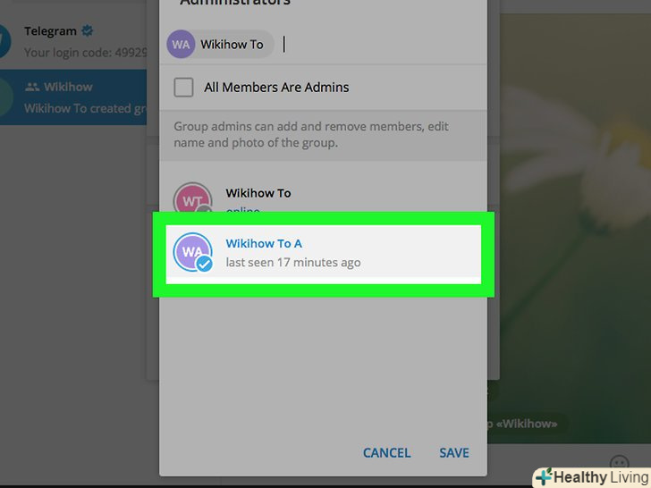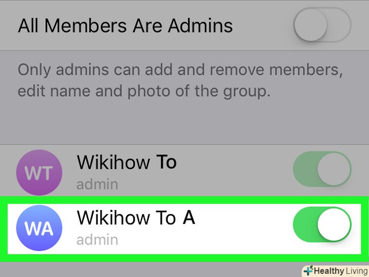 Натисніть на ім'я учасника, якого ви хочете зробити адміністратором.- Якщо ви редагуєте супергрупу, то у вас з'явиться опція установки спеціальних дозволів для цього адміністратора. Використовуйте перемикачі, щоб включити або відключити потрібні дозволи.[2]