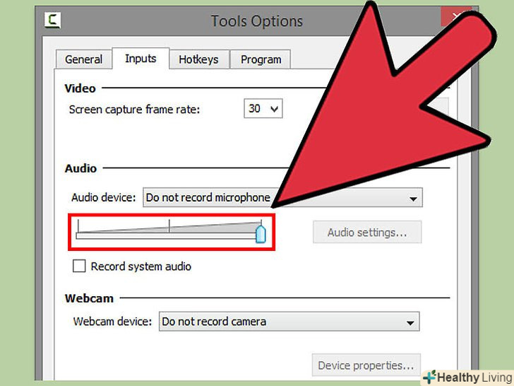 Перевірте працездатність аудіо-входу.якщо ви використовуєте мікрофон, скажіть в нього що-небудь перед записом і подивіться, чи змінюється індикатор рівня сигналу поруч з бігунком регулювання гучності. Перемістіть бігунок регулювання гучності так, щоб рівень сигналу від мікрофона був приблизно на середині шкали рівня гучності.