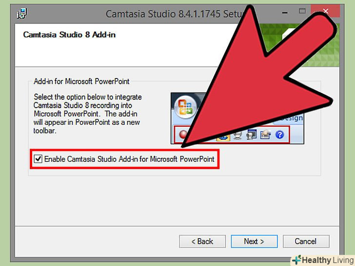 Виберіть додаткові опції установки.після введення ключа вам буде запропоновано вибрати місце установки Camtasia. Більшості користувачів підійде місце установки за замовчуванням. Вам також буде запропоновано встановити надбудову до PowerPoint, яка дозволить вам вставляти записи Camtasia в презентації PowerPoint.