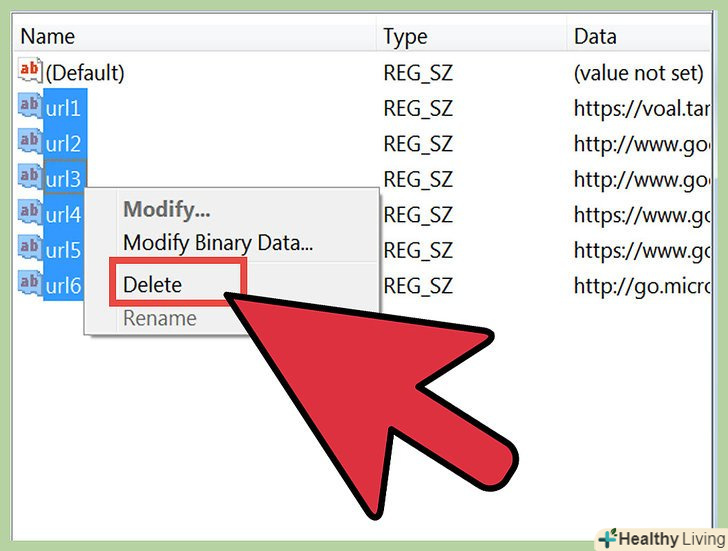 Видаліть адреси сайтів. можна видалити певні адреси або групи адрес. Після видалення адрес Internet Explorer не відображатиме їх в історії відвідувань і не пропонуватиме їх при автозаповнення. Ви можете видалити всі адреси, крім першого запису, яка взагалі не містить ніяких адрес (цей запис потрібен реєстру для стабільної роботи).- Для того щоб видалити певну адресу клацніть правою кнопкою миші по назві запису (в стовпці "Ім'я") і в меню виберіть"Видалити". У вікні з попередженням про видалення запису реєстру натисніть "Так".