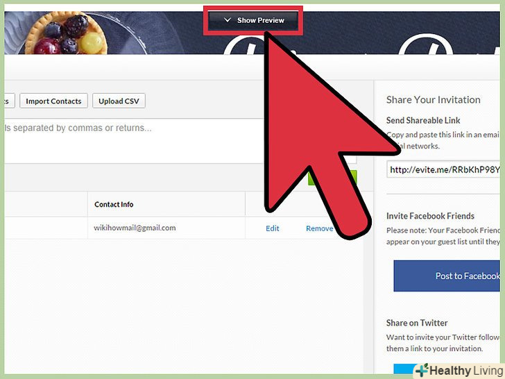 Натисніть "Preview Invitation" (Попередній перегляд запрошення) перед відправкою, щоб вловити будь-які помилки.Ваше запрошення з'явиться на екрані. Можливо, доведеться відключити блокувальник спливаючих вікон, щоб побачити запрошення.