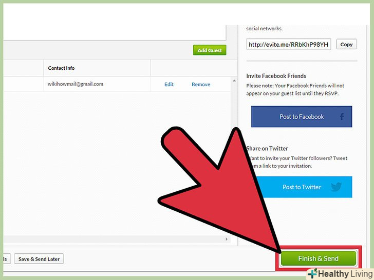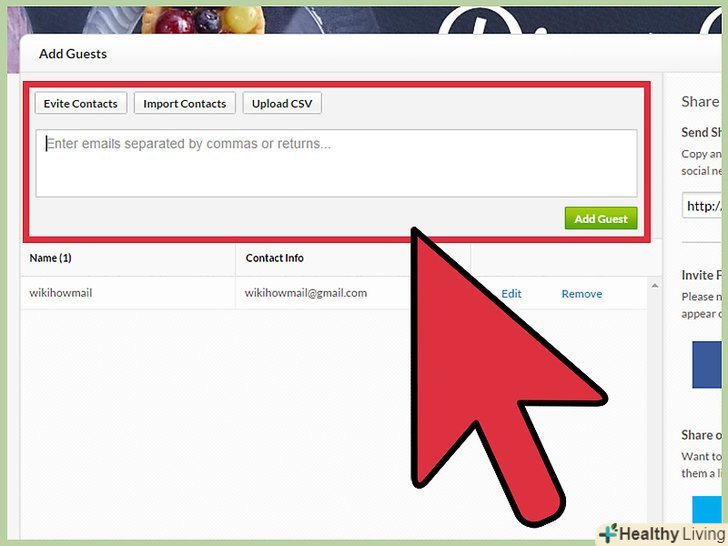 Додайте гостей.у вас є 3 варіанти. Ви можете додати їх вручну, розділивши комами. Якщо ви створювали Evite в минулому, то можете переглядати адреси, які використовували раніше. Можете імпортувати контакти, зв'язавши їх з Evite.