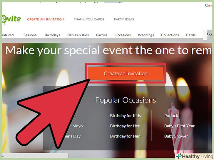 Натисніть кнопку " Create an Invitation "(створити запрошення) на головній сторінці Evite.існує також розділ " Create an Invitation "(створити запрошення) на панелі інструментів. Підійде будь-який з цих варіантів.