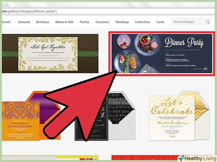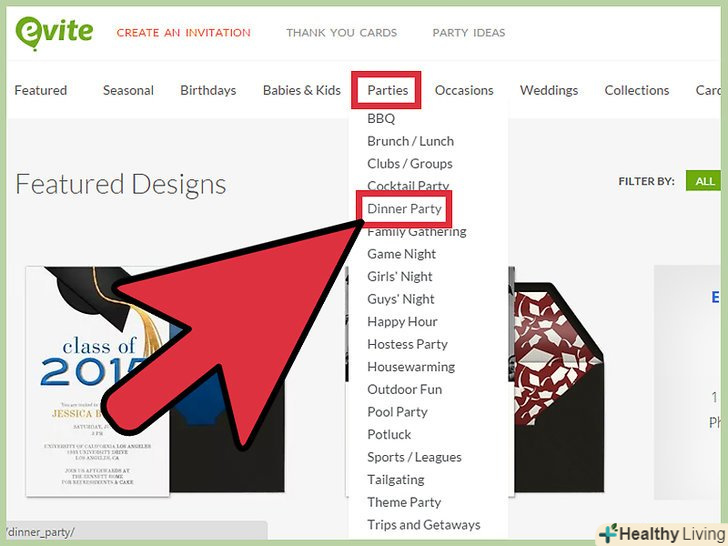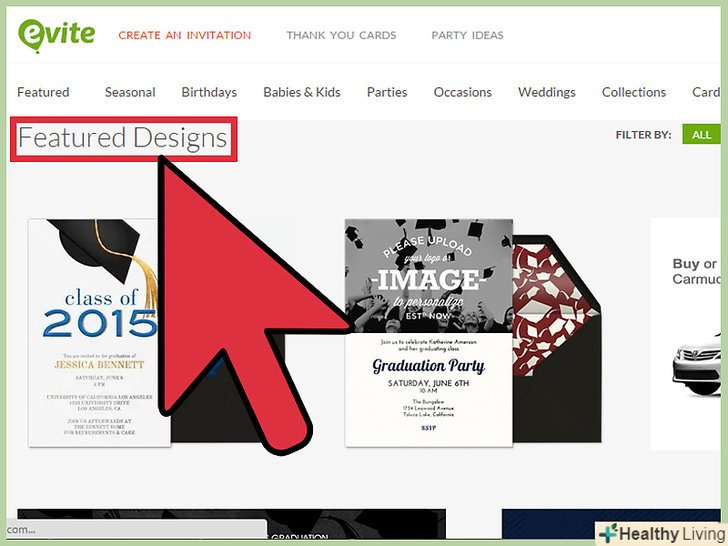Перегляньте список подій на лівій стороні сторінки. у верху повинні побачити опцію" Featured Designs " (рекомендований дизайн), яка відображає проекти (дизайн) нових або майбутніх свят. Важливою особливістю сайту Evite є те, що вони створюють креативні шаблони. Хоча й існують можливості для налаштування запрошень на випадок, якщо захочете розробити дизайн самі, але Evite не може бути найкращим місцем для створення і відправки запрошення.- Нижче опції "Featured Designs" побачите список свят або подій в алфавітному порядку (перегляд вертикальний): "Anniversary (ювілей), Baby Shower (вечірка для майбутньої матері), Baby's First Year (1 рік дитині), Bachelor Party (парубочий вечір)" і так далі.