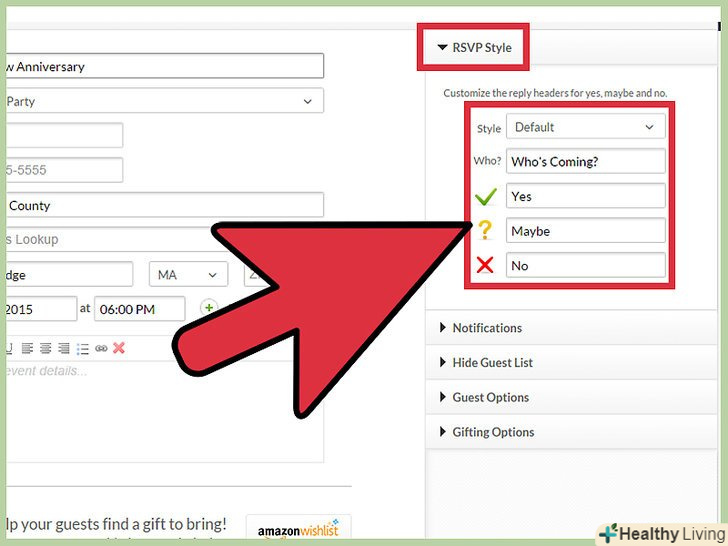 Виберіть стиль відповіді у верхньому лівому куті сторінки.прокрутіть випадаючий список під назвою "Default" (за замовчуванням), щоб побачити налаштовані стилі відповідей. Ви також можете створювати свої власні слова для вираження, якщо гості скажуть: "Yes "(так)," No "(ні) або" Maybe " (можливо).- Виберіть параметри в нижній частині сторінки. Встановіть прапорці для отримання повідомлень по електронній пошті, якщо є підписи на запрошенні RSVP, або встановіть обмеження на список гостей.