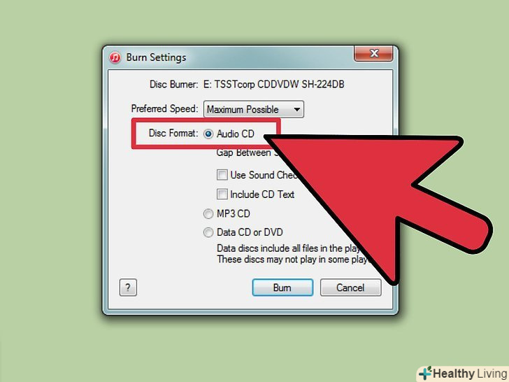 У вікні «Параметри запису» натисніть "аудіо CD".