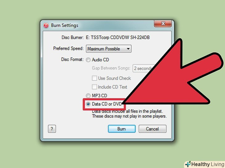 У вікні «Параметри запису» натисніть "CD або DVD-диск даних".