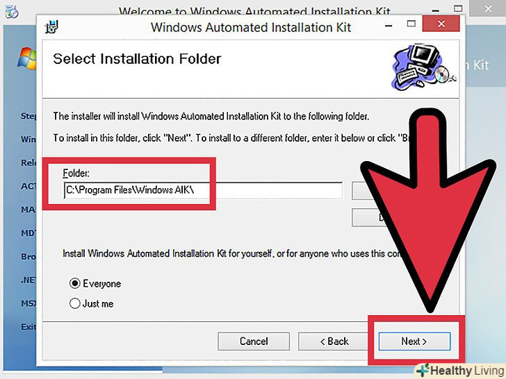 Виберіть папку для установки. ви можете залишити папку за замовчуванням (C:\Program Files\ Windows AIK\) або задати нове місце розташування. Натисніть "Далі".