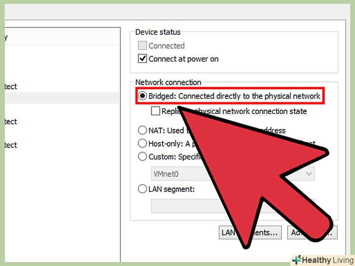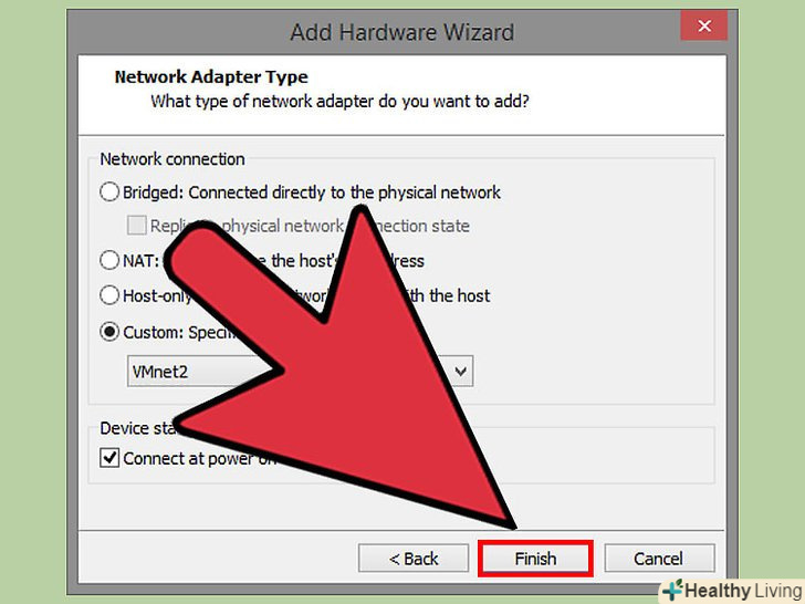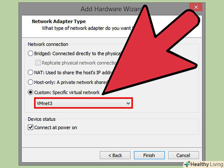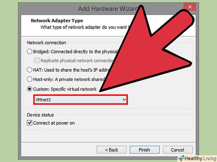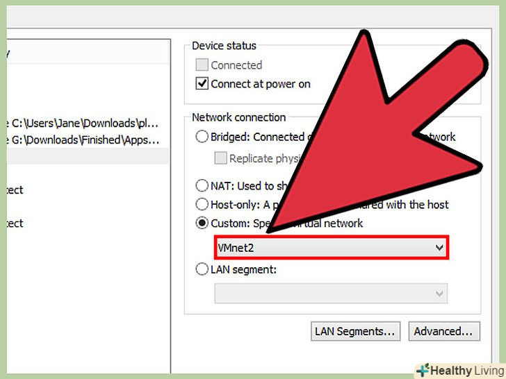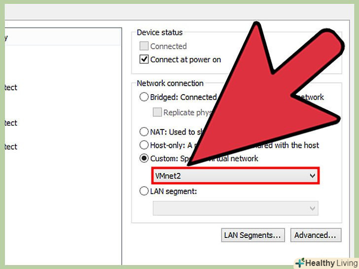 У правому віконці виберіть Custom (призначений для користувача) і виберіть в випадаючому меню Мережа VMnet2.