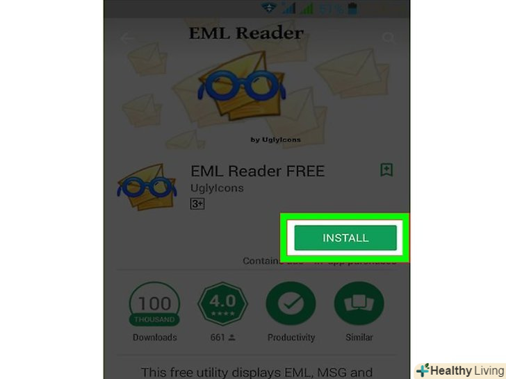 Скачайте безкоштовний додаток EML Reader Free. Android не підтримує формат EML, тому скористайтеся цим додатком.[6]- EML Reader FREE-популярний, але не єдиний додаток, що відкриває EML-файли. Якщо хочете, встановіть аналогічне додаток, знайшовши його в магазині Google Play (в пошуковому рядку введіть «eml reader» (без лапок)).