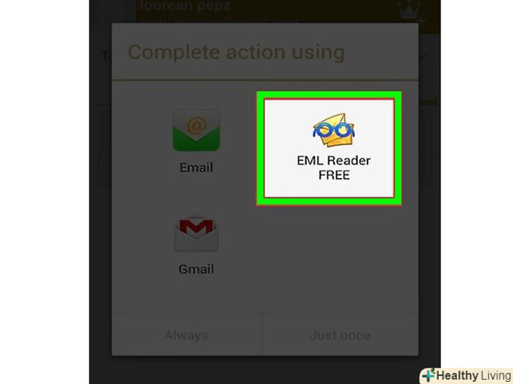 У списку програм виберіть "EML Reader FREE".при спробі відкрити EML-файл вам буде запропоновано вибрати додаток. EML Reader FREE повинен з'явитися в списку додатків. Натисніть "Завжди", щоб асоціювати EML-файли з цим додатком.