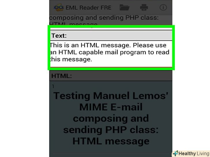 Перегляньте файл EML. EML Reader FREE розбиває EML-файл на розділи:» адреса«,» Дата«,» Тема«,» Текст«,» HTML «і»вкладення".- Розділ "Текст" містить текст листа.