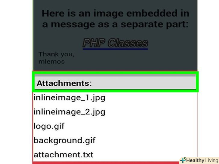 Натисніть і утримуйте вкладення, щоб відкрити його.у нижній частині екрана ви побачите список вкладень. Це всі зображення, які були використані при створенні HTML-повідомлення, а також будь-які файли, які не були прикріплені до листа.- Якщо натиснути і утримувати вкладення, відкриється нове меню. Виберіть "Відкрити", а потім виберіть програму, яка може відкрити даний тип файлу. Ви також можете вибрати "Зберегти", щоб витягти файл з EML-файлу і помістити його в ту ж папку.