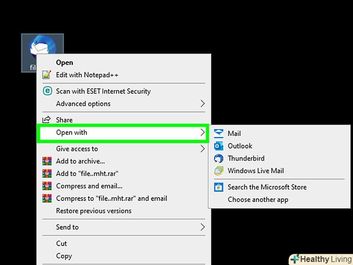 Перегляньте файл як звичайний текст. якщо вам не вдається відкрити файл у поштовому клієнті і перетворити його, щоб відкрити в Internet Explorer, ви можете переглянути EML-файл як звичайний текстовий файл. У ньому буде безліч незрозумілих символів, але ви зможете прочитати текст листа і знайти посилання. Ви не зможете переглянути зображення або вкладення до листів.- Клацніть правою кнопкою миші по EML-файлу і виберіть "Відкрити за допомогою".