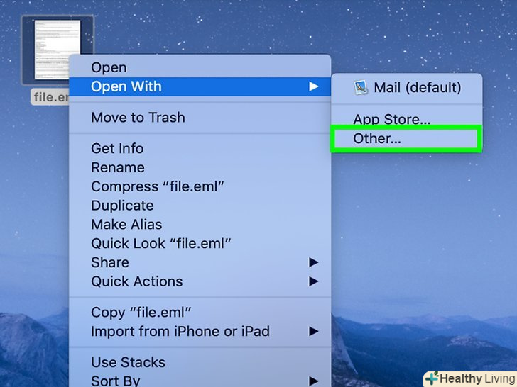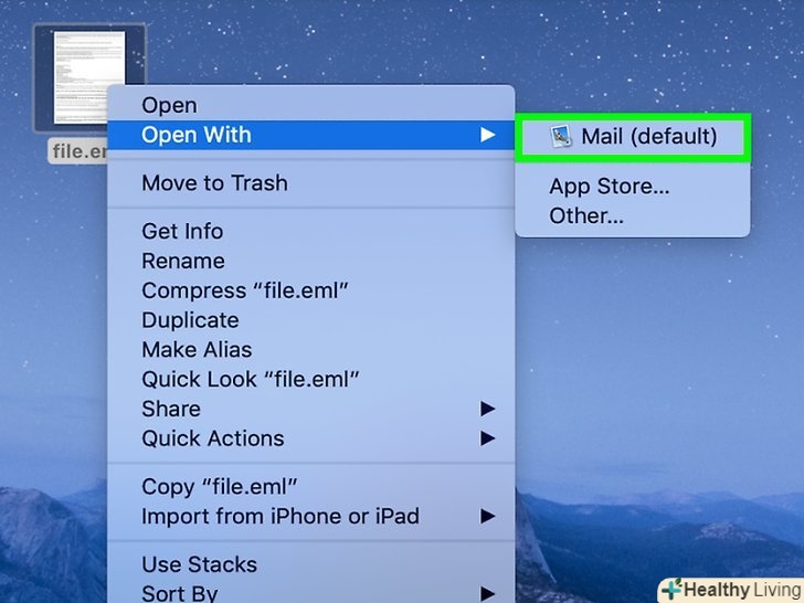Відкрийте EML-файл в Apple Mail. Apple Mail поставляється з Mac OS X і може відкривати і правильно відображати вміст EML-файлів.[3]- Клацніть правою кнопкою миші (або натиснітьCtrl і клацніть лівою кнопкою миші) по EML-файлу і виберіть «Відкрити за допомогою».
