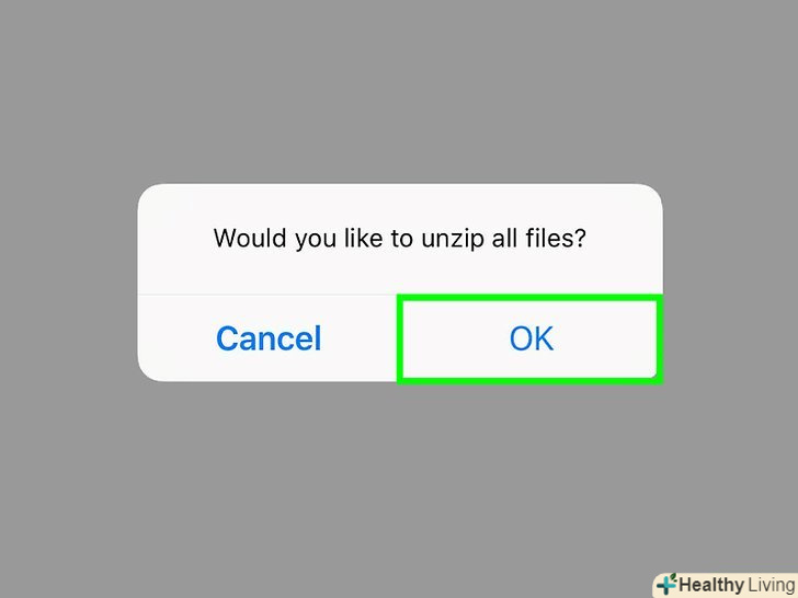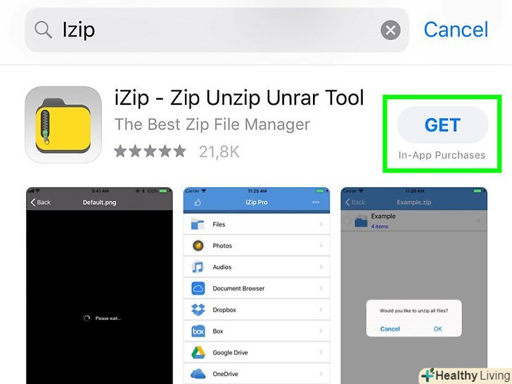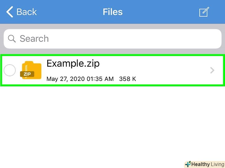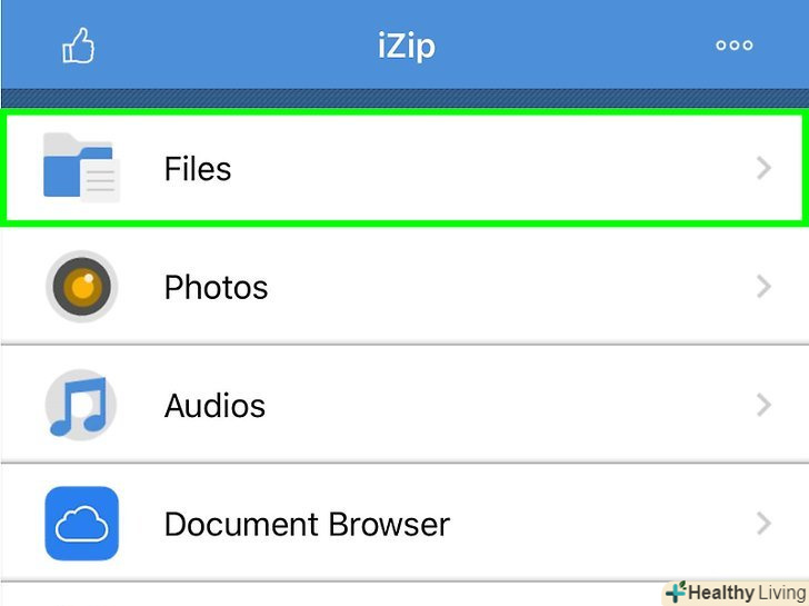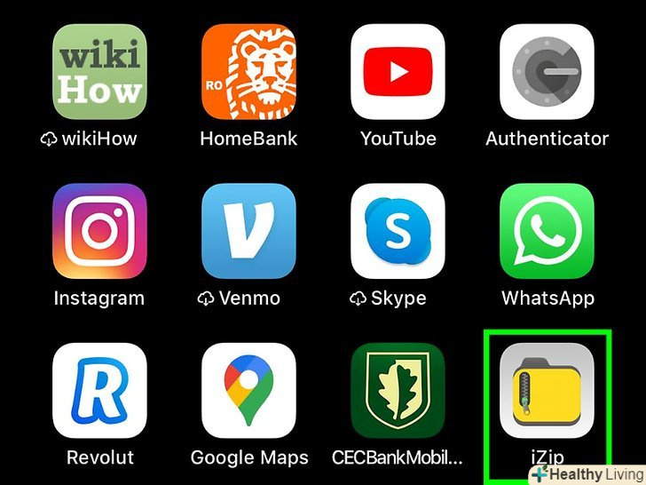 Знайдіть додаток "iZip" в App Store або Play Маркеті. Файл 7z-це стислий архів одного або декількох файлів. Для доступу до файлів всередині архіву потрібна програма, яка зможе їх витягти. Рекомендованою безкоштовною програмою для роботи з конкретно цим типом файлів є додаток iZip.[1]