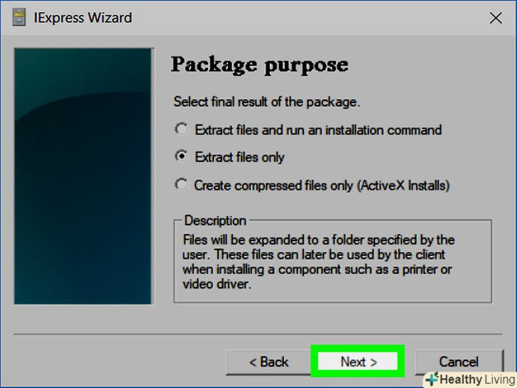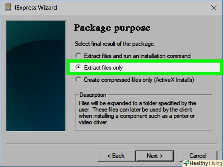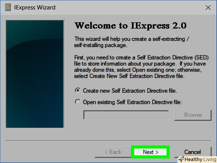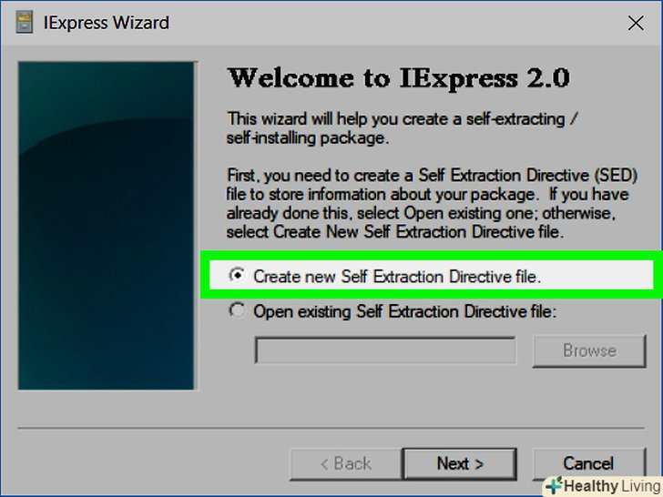 Поставте прапорець у опції "Create new Self Extraction Directive file" (створити новий саморозпаковується файл). вона знаходиться посередині сторінки. Ця опція повинна бути позначена за замовчуванням; в іншому випадку виділіть її.